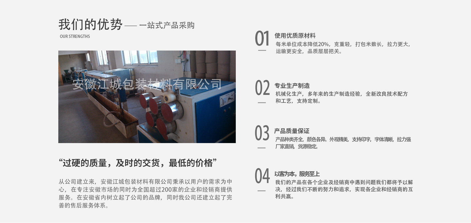 安徽江城包裝材料有限公司成立于2008年,注冊于2010年,公司總部設(shè)立在安徽蕪湖,是安徽省內(nèi)專業(yè)生產(chǎn)與銷售打包帶、透明膠帶的公司之一。公司主要效勞于大中小企業(yè),并大力開發(fā)省內(nèi)經(jīng)銷商。公司以“過硬的質(zhì)量,及時的交貨,低的價格”,為企業(yè)的立身之本。希望用我們的不懈努力,帶給我們客戶大的效益。從公司建立來,安徽江城包裝材料有限公司秉承以用戶的需求為中心,在專注安徽市場的同時為全國超過200家的企業(yè)和經(jīng)銷商提供服務(wù),“過硬的質(zhì)量,及時的交貨,低的價格”博得了縱多的企業(yè)和經(jīng)銷商的好評,在安徽省內(nèi)逐步樹立起了公司的品牌,同時我公司還建立起了完善的售后服務(wù)體系。為我們的產(chǎn)品在各個企業(yè)及經(jīng)銷商中遇到的問題予以解決,經(jīng)過我們不斷的努力和追求,實(shí)現(xiàn)各企業(yè)和經(jīng)銷商的互利共贏。